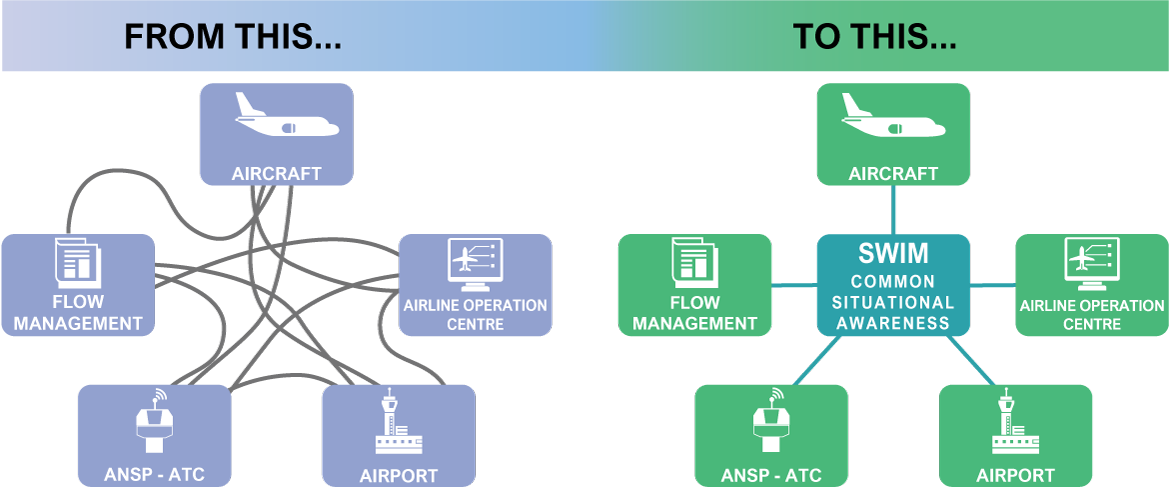 The background motivation for the work is the introduction of the SWIM concept for ATM information management. SWIM is one of the major results of SESAR, and its adoption constitutes a dramatic change in how ATM services are provided. Before SWIM, ATM information management was mostly based on point-to-point message transfer, meaning information producers had to decide in advance who the target recipients would be. Applications typically made limited or no use of any kind of standards, and used tightly coupled APIs that hindered interoperability. The adoption of SWIM will change all this because it is based on the information sharing approach where information producers do not need to know anything about who might use the information, and where information consumers can access information from different sources as they please. SESAR’s AIRM (ATM Information Reference Model) provides a standardized common “vocabulary”, making it feasible to develop interoperable, smart applications that can use data from different sources, combining it and filtering it to the specific needs of information consumers. This makes it easier to achieve the high-level goal of common situational awareness as indicated in Figure 1, which is in turn a key enabler for achieving the high-level goal of CDM (Collaborative Decision Making) in ATM.
